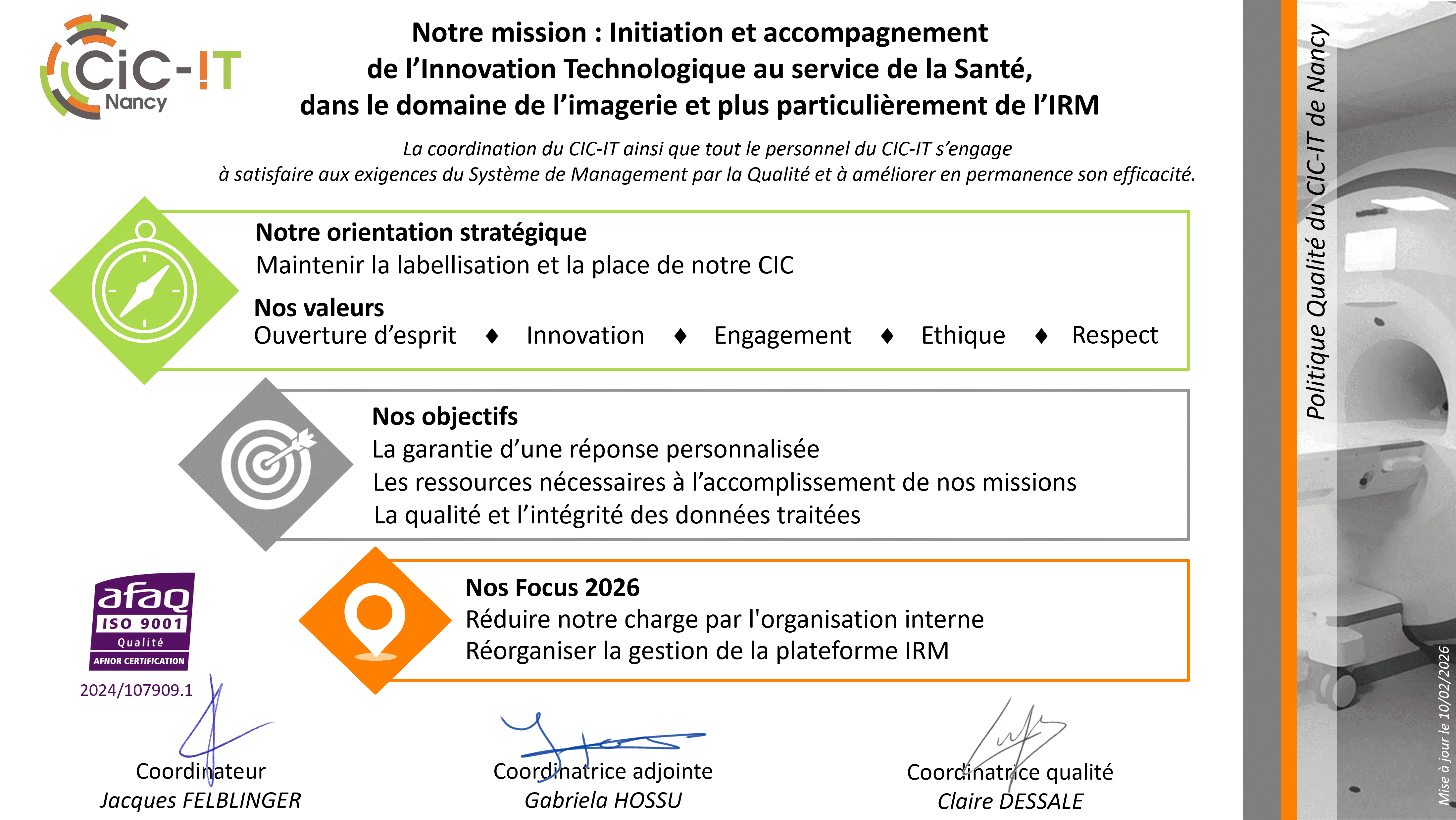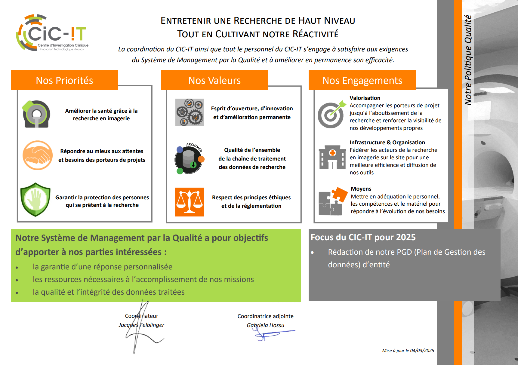 Le 24 janvier 2024, le CIC-IT de Nancy a été certifié ISO 9001:2015 pour ses activités d’initiation et d’accompagnement de l’innovation technologique au service de la santé, dans le domaine de l’imagerie et plus particulièrement de l’IRMLe terme IRM signifie Imagerie par Résonance Magnétique mais il peut désigner l'examen, l'image ou l'imageur.Pour en savoir + sur l'IRM et son principe More.